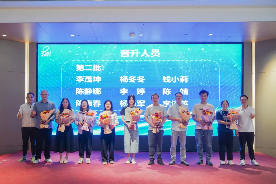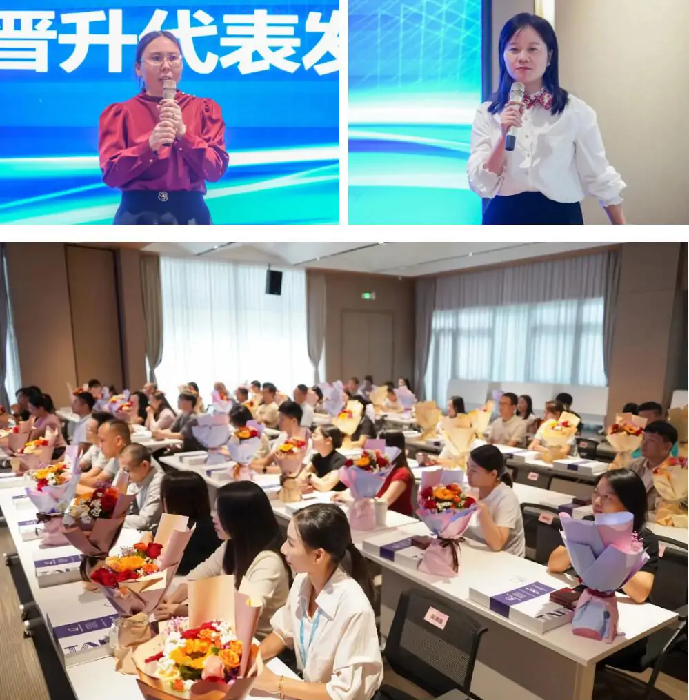随后,仪式进入了表彰颁奖环节。颁奖分六批次进行,每位晋升员工都荣获了象征荣誉的鲜花和晋升徽章,这不仅是对他们努力的认可,更是对未来的期许。