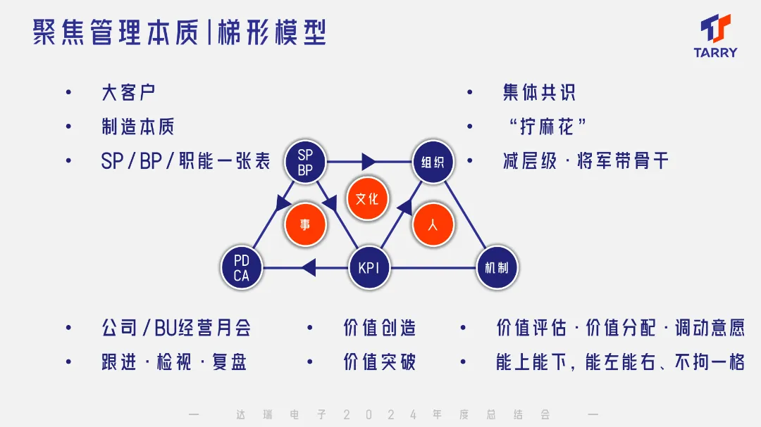 “梯形模型”以SP/BP为出发点,将大客户和制造作为星空游戏官网·(中国)登陆入口一切战略的圆心,最终形成覆盖所有部门的战略与经营一张表,以进行时刻检视和纠偏。